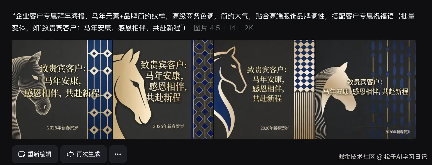 即梦AI操作:打开即梦AI,选“图片生成”,输入提示词:“企业客户专属拜年海报,马年元素+品牌简约纹样,高级商务色调,简约大气,贴合高端服饰品牌调性,搭配客户专属祝福语(批量变体,如‘致贵宾客户:马年安康,感恩相伴,共赴新程’),批量生成4套,风格统一,适配朋友圈和客户私信发送尺寸”。
