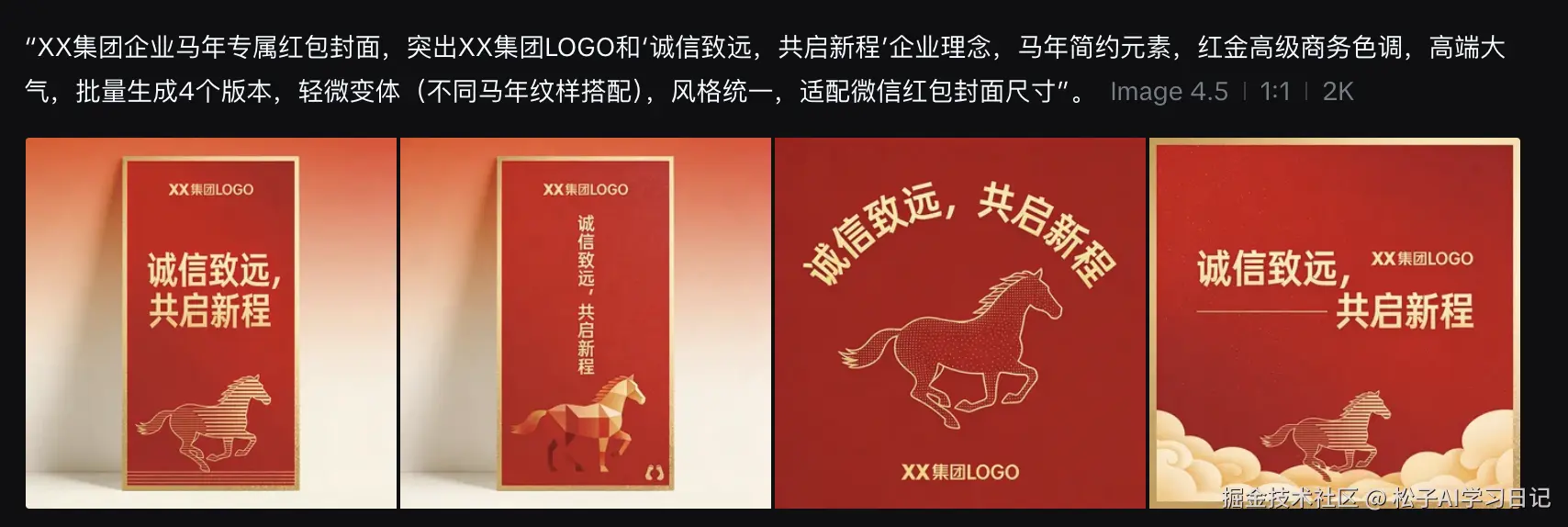 即梦AI操作:打开即梦AI,选“图片生成”,输入提示词:“集团企业马年专属红包封面,突出集团LOGO和‘诚信致远,共启新程’企业理念,马年简约元素,红金高级商务色调,高端大气,批量生成4个版本,轻微变体(不同马年纹样搭配),风格统一,适配微信红包封面尺寸”