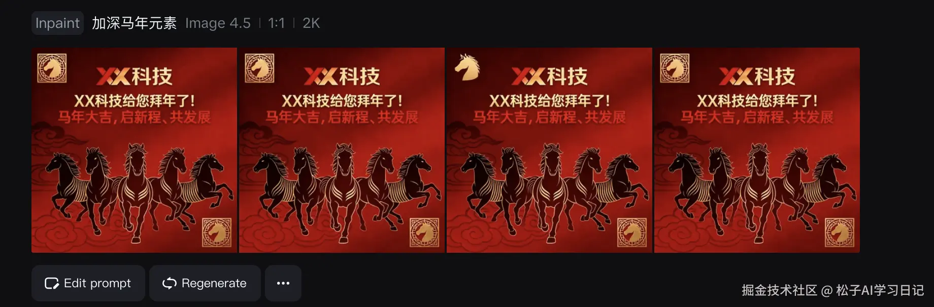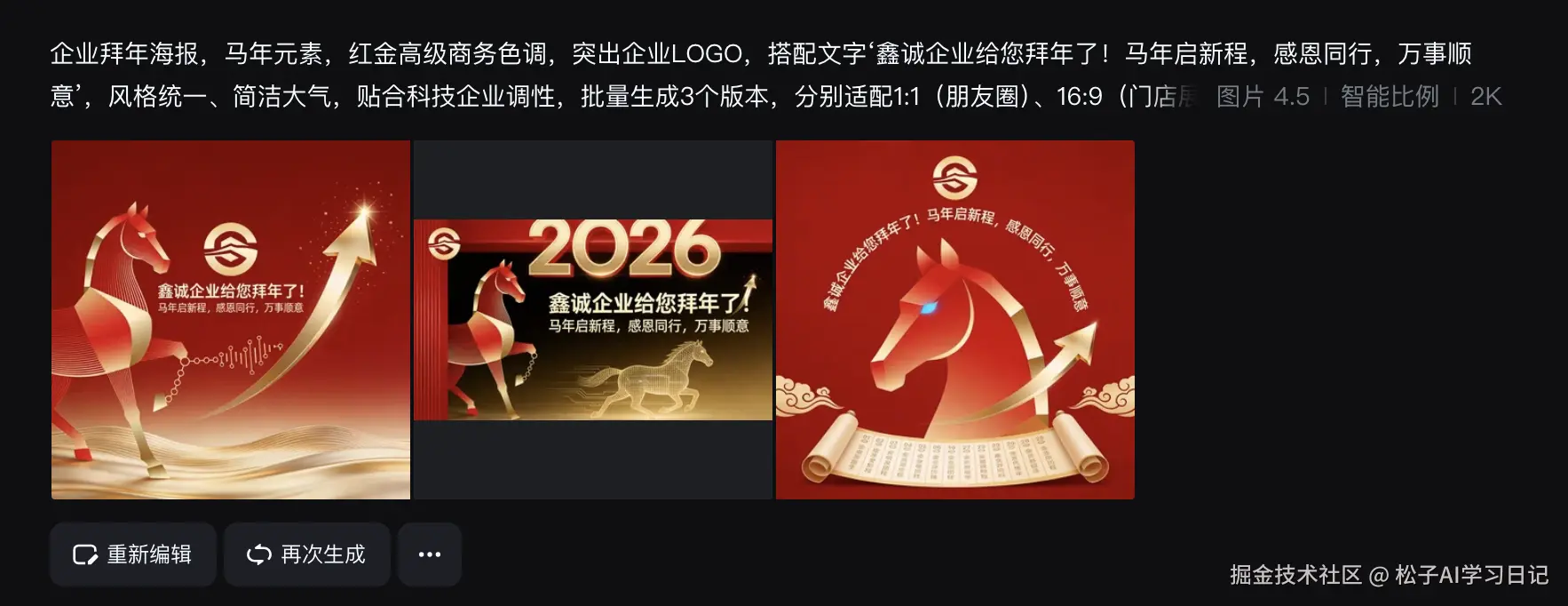- 第三步:输入提示词(直接抄,替换企业信息即可)——“XX企业拜年海报,马年元素,红金高级商务色调,突出XX企业LOGO的形象,搭配文字‘XX科技给您拜年了!马年大吉,启新程、共发展’,批量生成3个版本、轻微变体(不同马年纹样搭配),风格统一、简洁大气,贴合企业商务调性”。