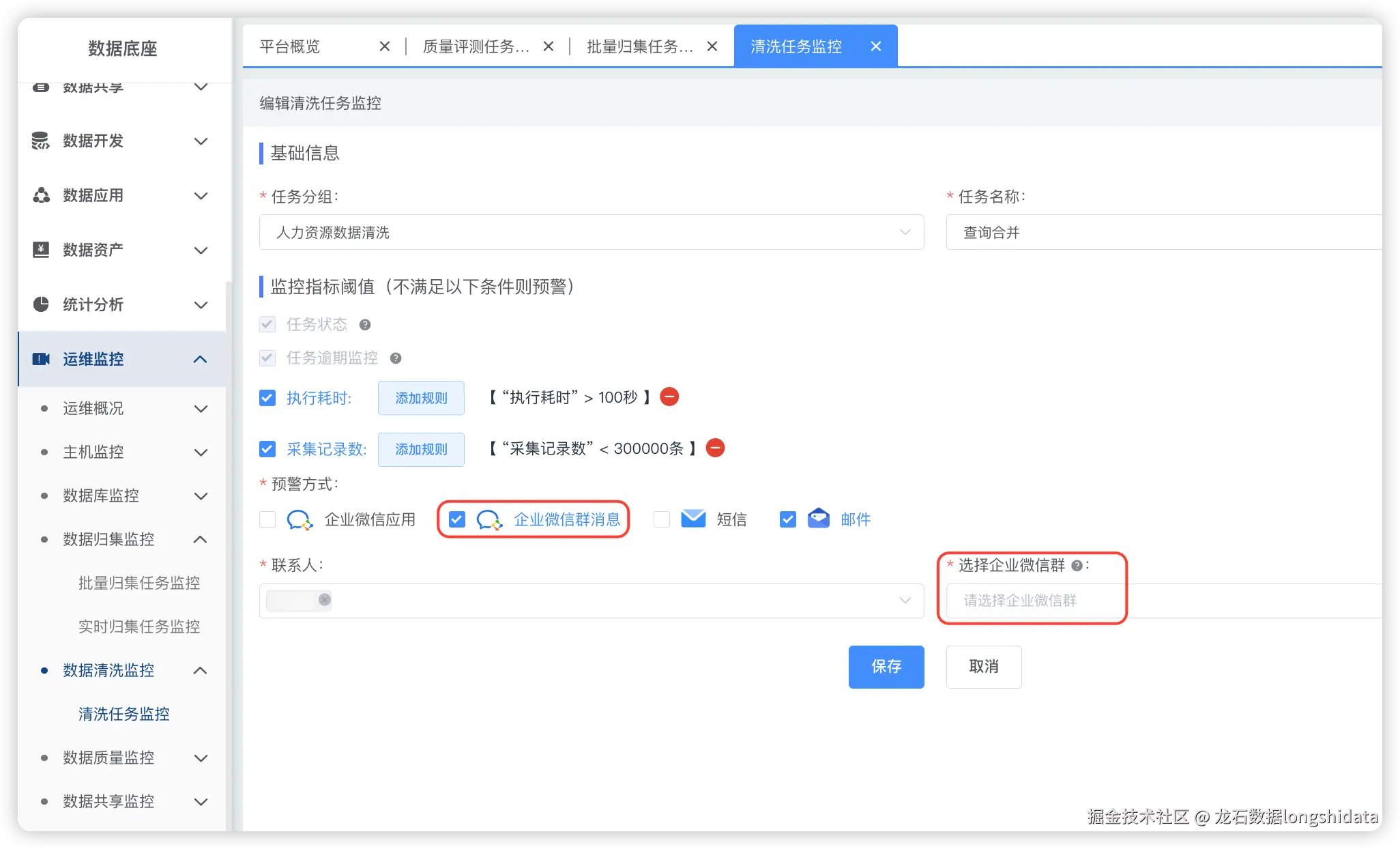 - 扩展预警渠道:在数据归集监控、数据清洗监控、数据共享监控模块中,增加企业群消息预警功能,实现异常信息及时同步。