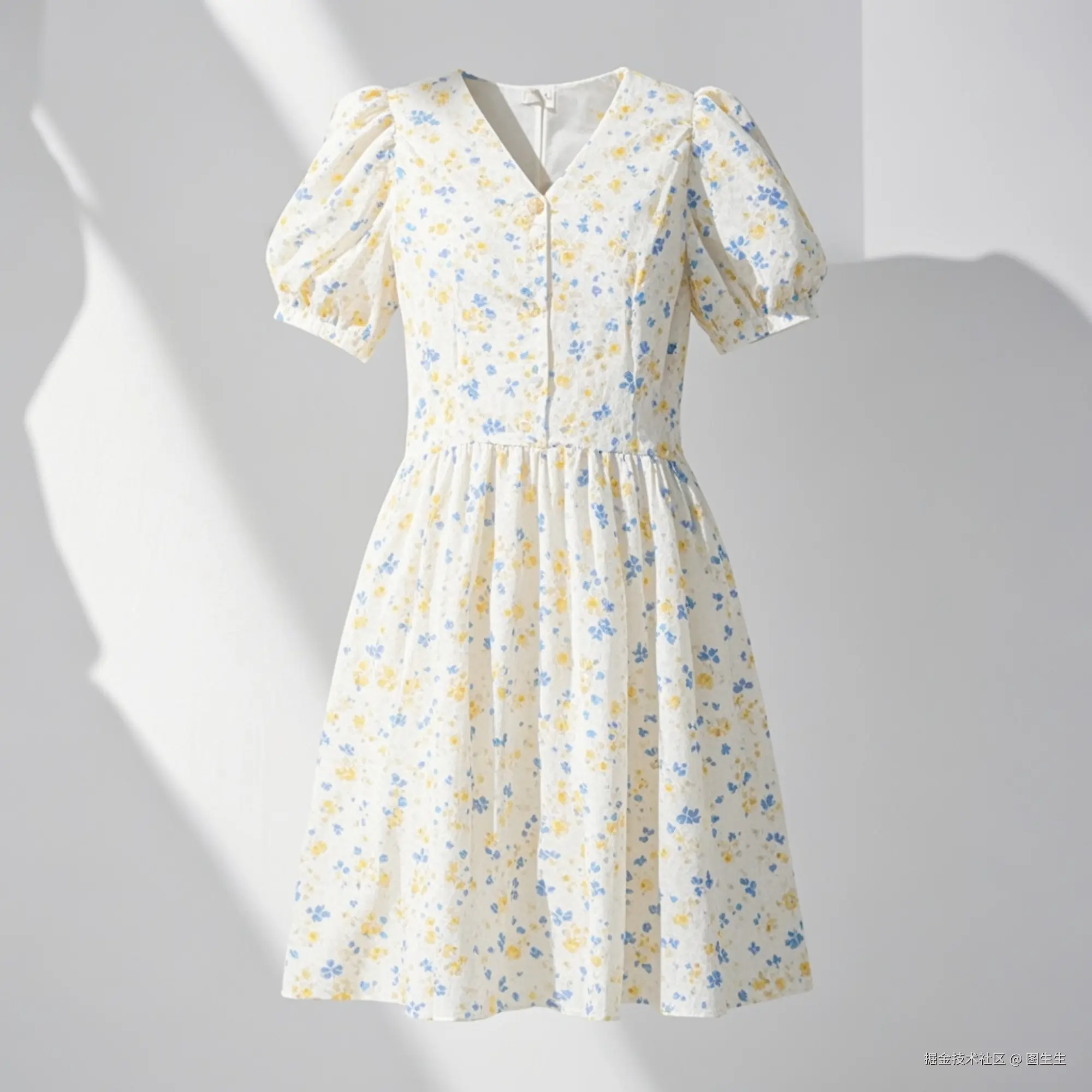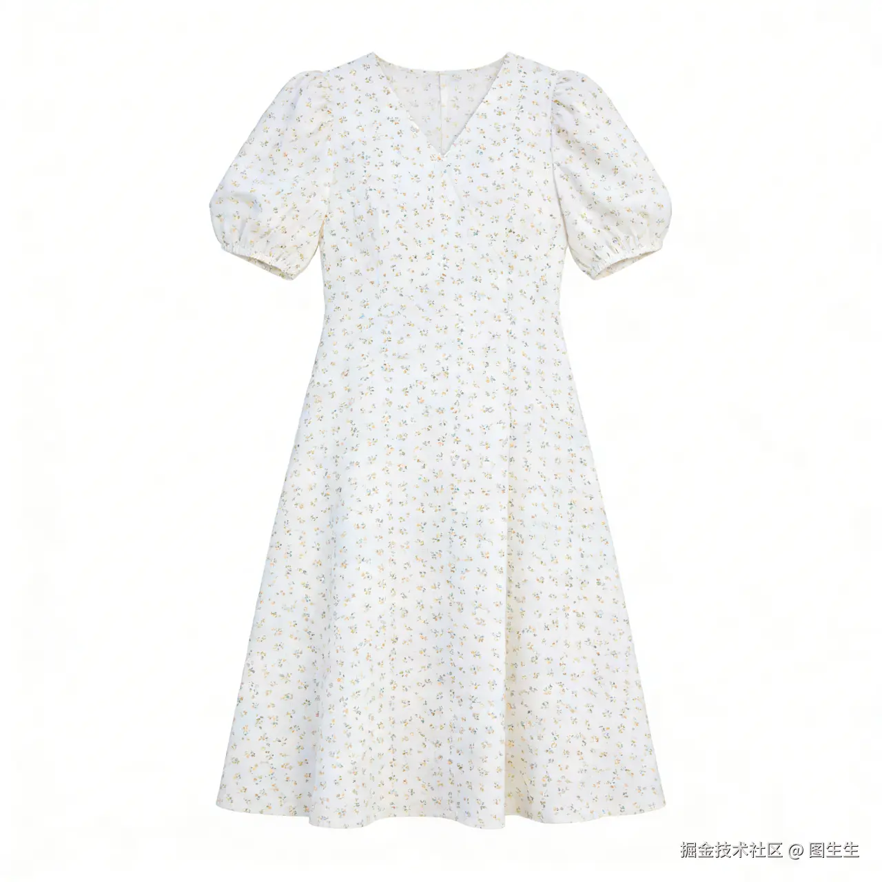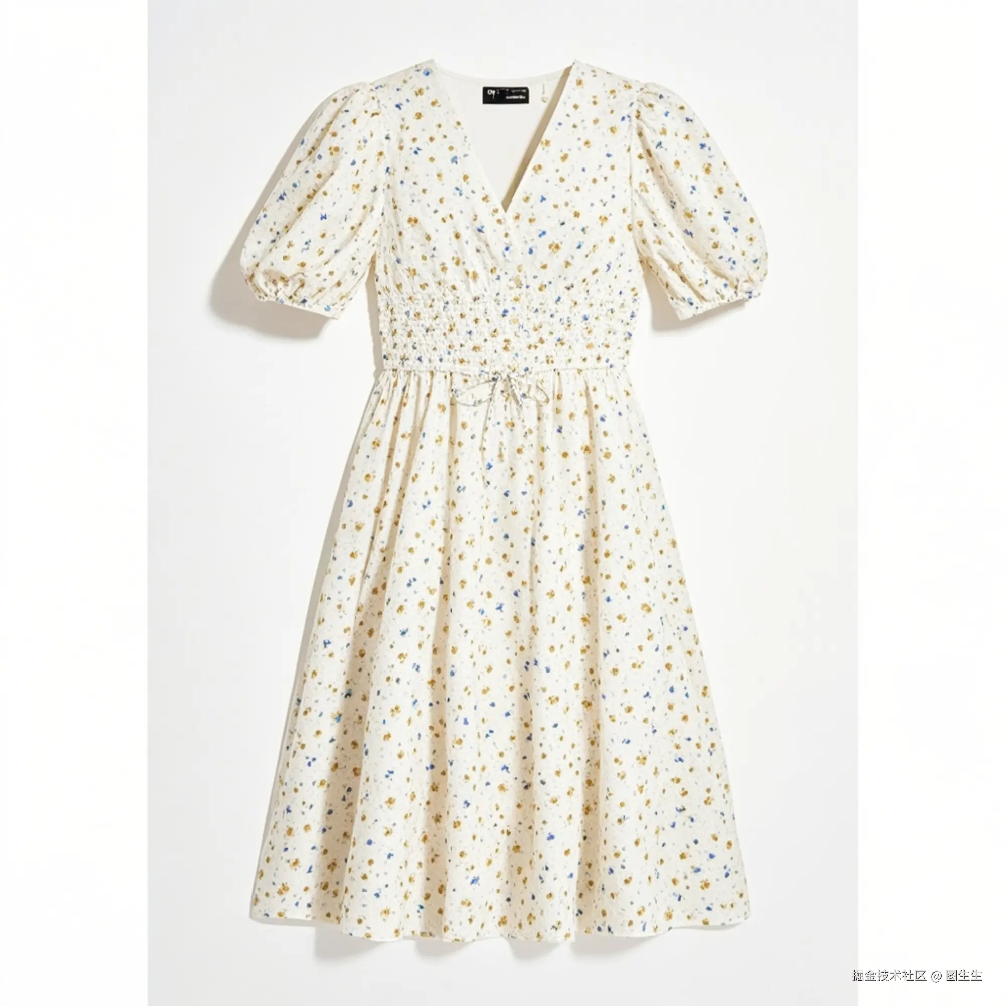 ◇裂变图2:保持泡泡袖和V领版型不变,将底色改为米白色,碎花配色调整为浅蓝+浅黄撞色,添加腰间同色系蝴蝶结装饰,腰间增加松紧带。