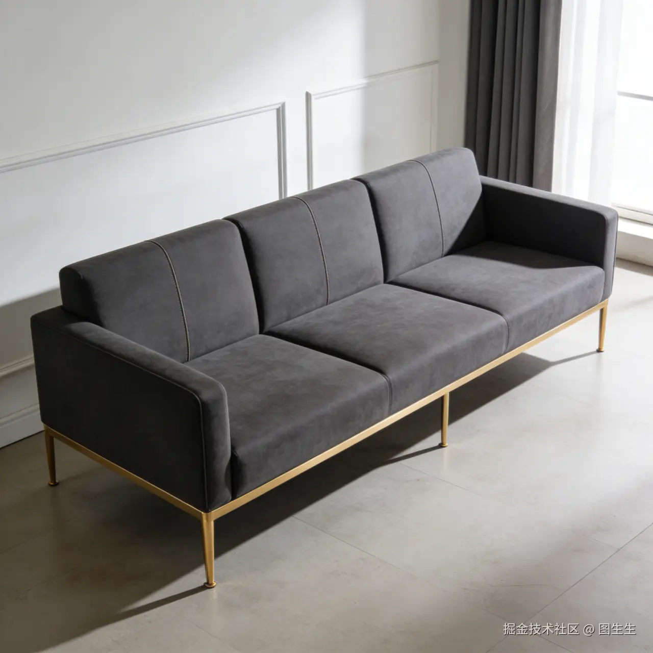 现代轻奢风三人位直排沙发;核心元素:深灰色科技布、不锈钢镀金细脚、高回弹海绵靠背、无扶手设计、极简缝线工艺