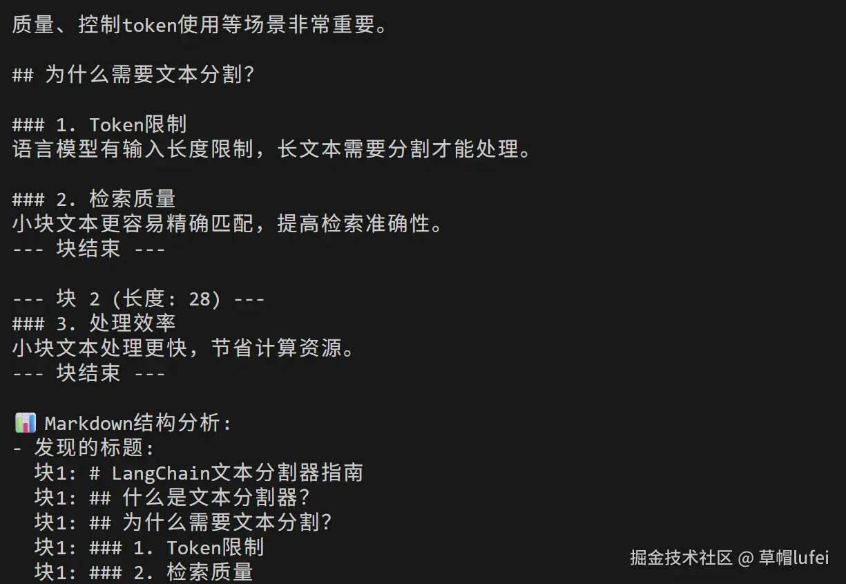 Markdown分割器专门用于分割Markdown文档,会保持Markdown的结构完整性,会识别标题、列表、代码块等Markdown元素,确保分割不会破坏文档结构