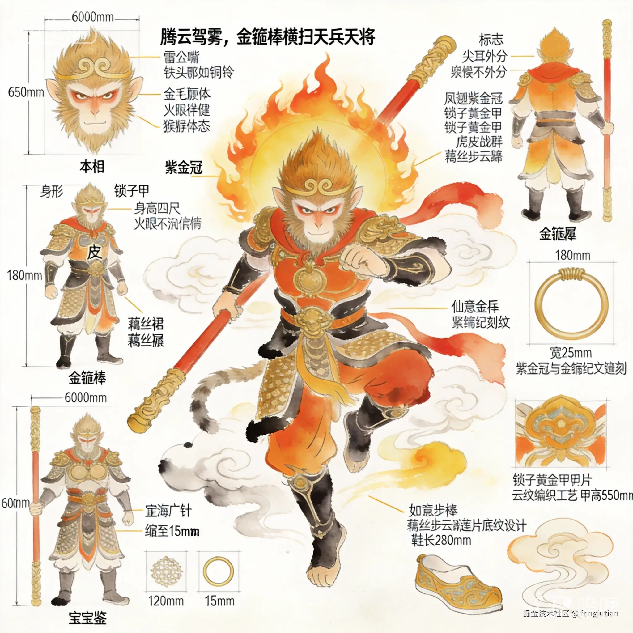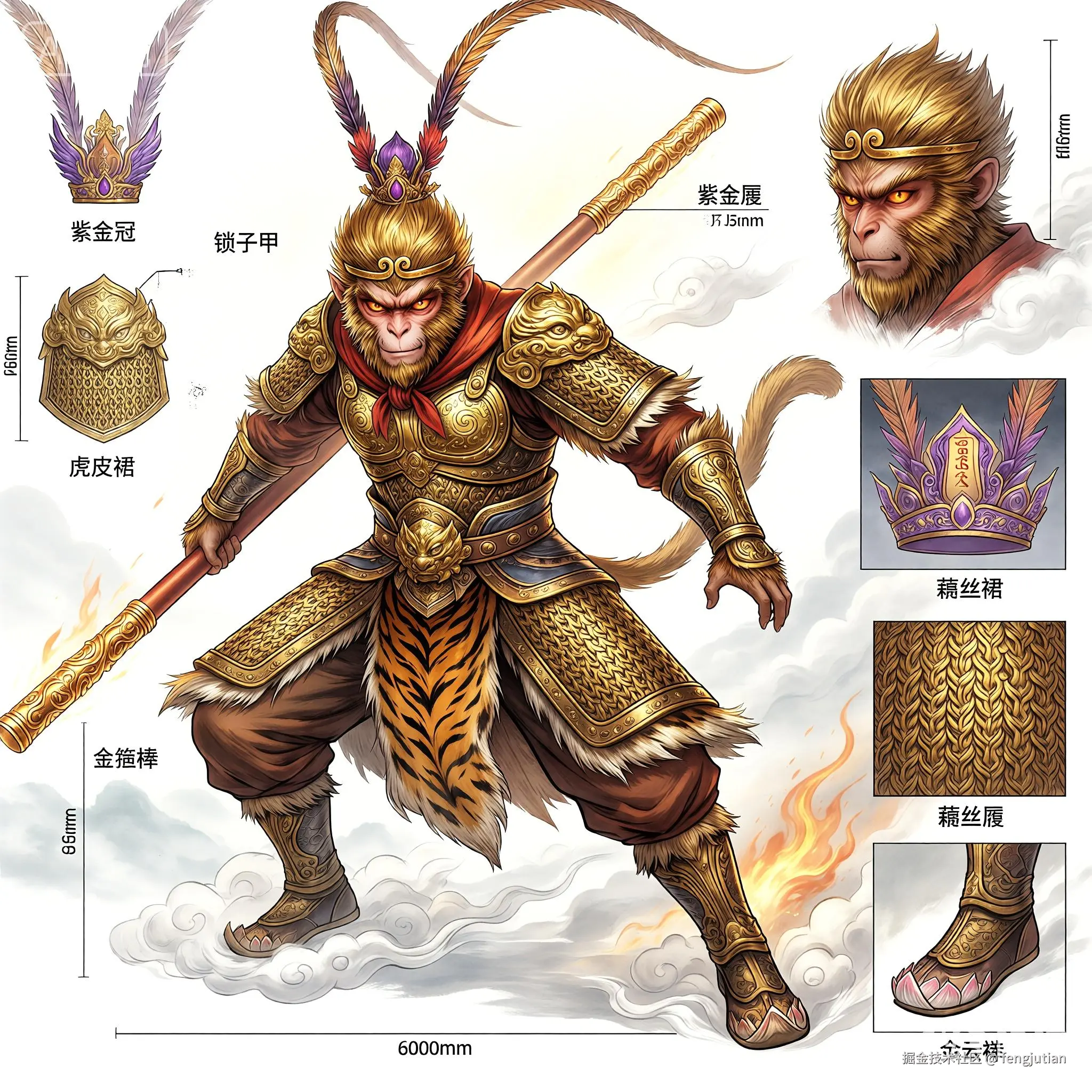 角色设计稿,白色背景,技术蓝图风格,仙法神器尺寸标注与中文批注,多角度散点缩略图,展示天界战神造型设计全流程。 【典籍出处】《西游记》第七回:八卦炉中逃大圣 五行山下定心猿 【角色档案】 姓名法号:孙悟空,道号"齐天大圣",法名"孙行者" 出身来历:东胜神洲花果山水帘洞,仙石孕育天生石猴 修为神通:太乙金仙境,七十二变,筋斗云十万八千里,火眼金睛 【形貌特征】 本相:雷公嘴,铁额头,金毛覆体,火眼金睛如铜铃 身形:身高四尺,精悍矫健,猿猴体态 标志:头戴金箍(紧箍咒),尖耳外翻,桀骜不驯神情 【仙装法衣】 头冠:凤翅紫金冠,内嵌金箍一道 主甲:锁子黄金甲,云纹火焰纹交织 下裳:虎皮战裙(打虎所得) 足履:藕丝步云履,踏云而行 【法宝神兵】 主法宝:如意金箍棒(重一万三千五百斤,可大可小,默认长六米,碗口粗细) 头上金箍:紧箍咒刻纹,随咒收紧 神通具象:筋斗云呈祥云托举状 水彩融合水墨渲染,敦煌壁画 + 明刊神魔小说插图风格,霞光金红为主 + 祥云素白 + 神火橙黄 【法宝图鉴】 如意金箍棒:定海神针铁纹理特写(默认长6000mm,直径120mm,可缩至绣花针15mm) 紫金冠与金箍:咒文镌刻细节(金箍直径180mm,宽25mm) 锁子黄金甲:甲片与云纹编织工艺(甲高650mm) 藕丝步云履:莲瓣底纹设计(鞋长280mm) 筋斗云:灵气流转形态图 【画面构成】 主角色呈「腾云驾雾,金箍棒横扫天兵天将」桀骜战姿 周围标注:(紫金冠,锁子甲,虎皮裙,藕丝履,金箍棒) 尺寸标记:6000mm,180mm,650mm 【视觉特质】桀骜不驯反叛之魂,齐天大圣通天彻地,超高清神话细节标注,明代神魔志怪美学,东方玄幻CG,大闹天宫气吞山河