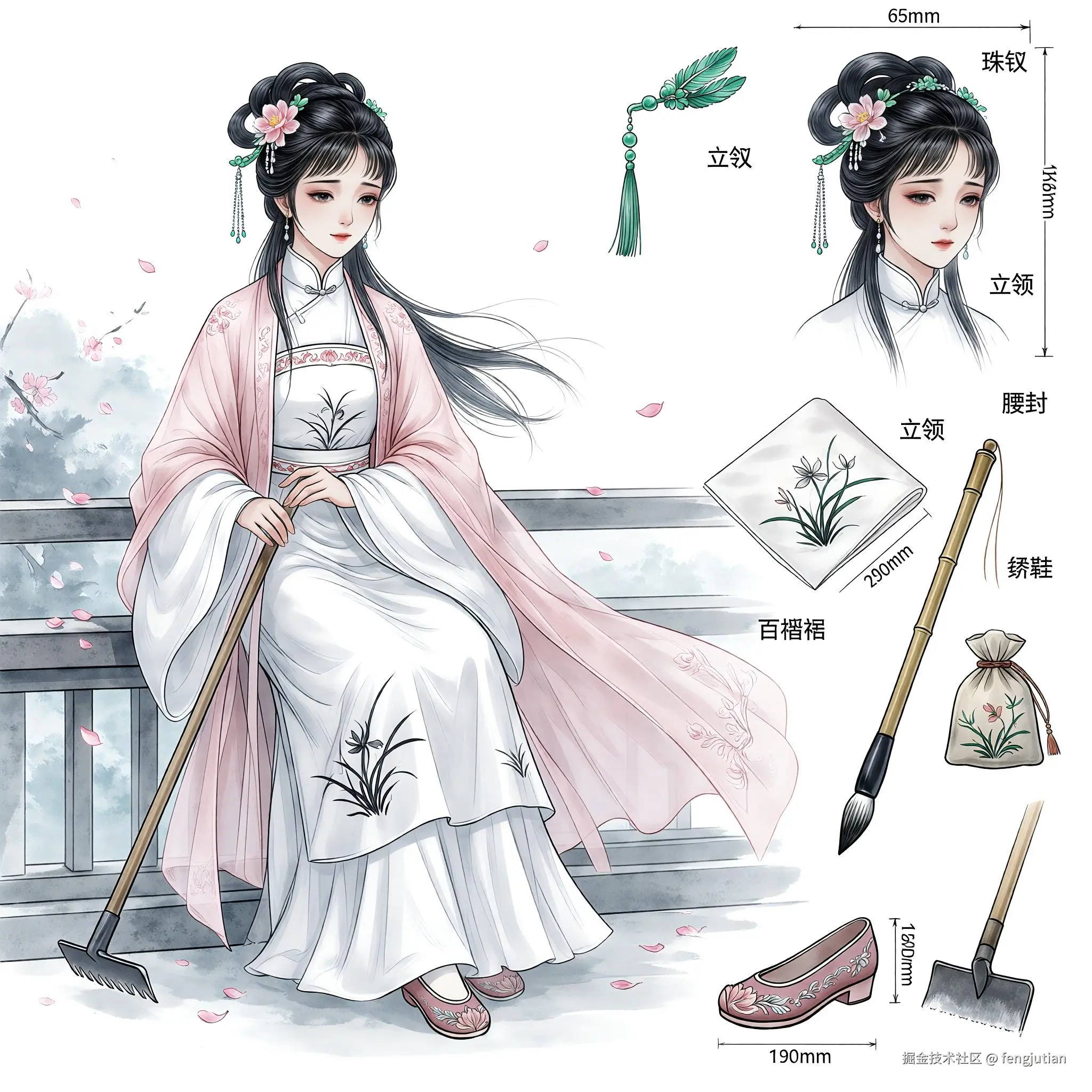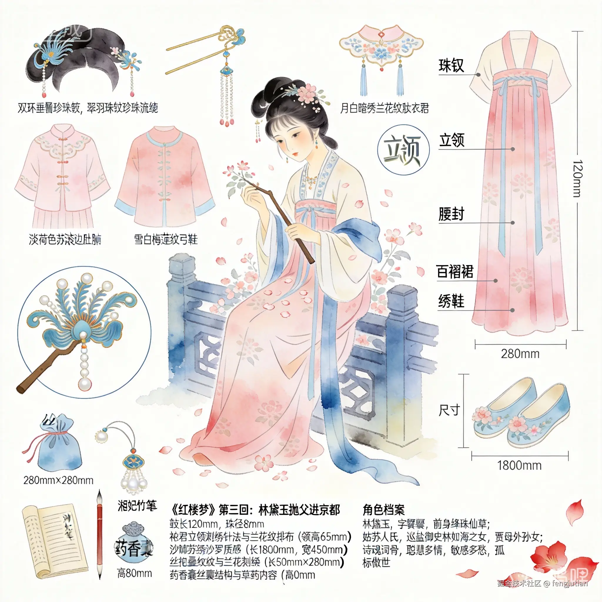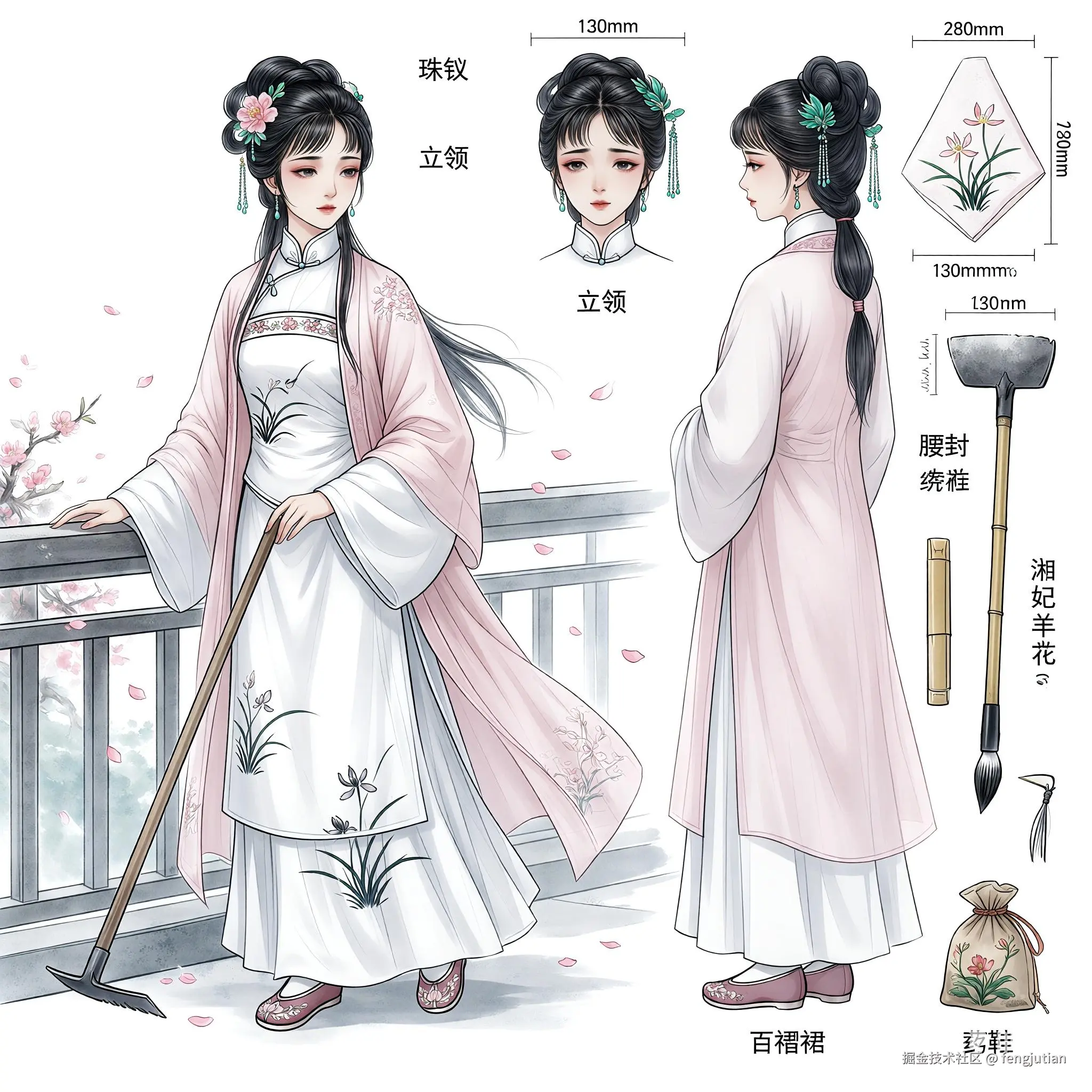 角色设计稿,白色背景,技术蓝图风格,闺阁服饰精细尺寸标注与中文批注,多角度散点缩略图,展示清代贵族小姐造型设计全流程。 【典籍出处】《红楼梦》第三回:林黛玉抛父进京都 【角色档案】 姓名表字:林黛玉,字颦颦,前身绛珠仙草 出身来历:姑苏人氏,巡盐御史林如海之女,贾母外孙女 性情气质:诗魂词骨,聪慧多情,敏感多愁,孤标傲世 【相貌特征】 两弯似蹙非蹙罥烟眉,一双似喜非喜含情目,态生两靥之愁,娇袭一身之病。泪光点点,娇喘微微。肌肤胜雪,削肩细腰,身姿如弱柳扶风,病态之美更添仙姿。 【闺秀装束】 发髻:青丝如云,双环垂髻少女发式,珍珠簪点缀 头饰:小巧翠羽珠钗,缀细小珍珠流苏,鬓边斜插鲜花一朵 主衣:月白色丝缎袄裙,暗绣兰花纹样,立领精致 外披:淡粉色苏绣纱帔,轻薄若烟 内衬:雪白丝绸肚兜,梅花滚边 足履:藕荷色绣花弓鞋,莲纹鞋面 【随身物件】 贴身之物:丝帕一方,绣兰花角,拭泪常备(280mm见方) 案头之物:诗稿一卷,湘妃竹管羊毫笔 随身香囊:药香囊一枚,内盛养身草药 意象之花:落红片片,葬花之锄 水彩融合水墨渲染,清代仕女画 + 文人工笔风格,月白素雅为主 + 淡粉点染 + 烟灰蓝意境 + 翠玉点缀 【服饰图鉴】 翠羽珠钗:点翠工艺与珍珠镶嵌细节(钗长120mm,珠径8mm) 袄裙立领:刺绣针法特写,兰花纹样排布(领高65mm) 纱帔披帛:苏绣纱罗通透质感(长1800mm,宽450mm) 丝帕手绢:折叠纹路与兰花刺绣(280mm × 280mm) 药香囊:丝囊结构与草药内容(高80mm) 【画面构成】 主角色呈「倚栏葬花,手持花锄,落英缤纷环绕,神情幽怨」之姿 周围标注:(珠钗,立领,腰封,百褶裙,绣鞋) 尺寸标记:120mm,280mm,1800mm