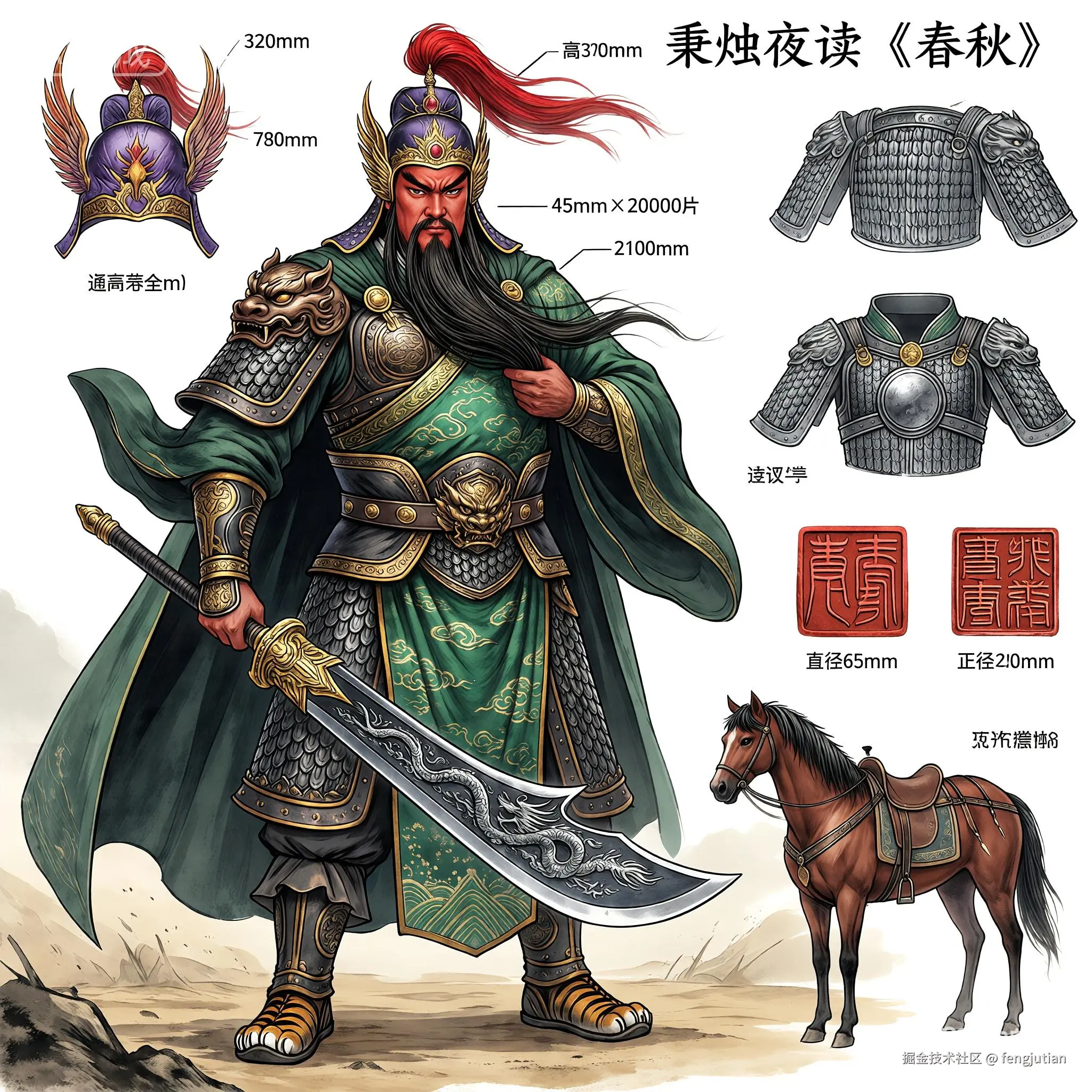 角色设计稿,白色背景,技术蓝图风格,详细尺寸标注与中文批注,多角度散点缩略图,展示汉末武将铠甲设计全流程。 【典籍出处】《三国演义》第一回:宴桃园豪杰三结义 【角色档案】 姓名字号:关羽,字云长,人称"美髯公""武圣" 阵营势力:蜀汉 · 前将军 · 汉寿亭侯 性格铭刻:忠义无双,傲上而不忍下,义薄云天 【相貌特征】 身长九尺,面如重枣,唇若涂脂,丹凤眼,卧蚕眉,髯长二尺,威风凛凛,相貌堂堂 【甲胄体系】 头盔:凤翅紫金冠,赤红盔缨飘扬 铠甲:兽面吞头连环铠,铜兽肩吞,胸镶护心镜 战袍:翠绿锦缎云纹袍,金线滚边 披风:墨绿大氅,金扣系颈 【兵刃坐骑】 主兵器:青龙偃月刀(刀刃780mm,刀杆2100mm,重八十二斤) 副兵器:腰悬铁剑 坐骑:赤兔马,金鞍玉辔,火焰般鬃毛 水彩融合水墨渲染,明代绣像版画风格,玄铁墨色为底 + 朱砂赤红点缀 + 鎏金勾边 【装备拆解图】 青龙偃月刀:刀身锻纹特写,龙纹浮雕细节(刃长780mm,杆长2100mm) 凤翅紫金冠:结构爆炸分解图(通高320mm) 连环铠:甲片排列与兽面肩吞工艺(甲片45mm × 2000片) 汉寿亭侯印:正反双面篆刻(直径65mm) 赤兔马具:鞍鞯辔头镫全套分解图 【画面构成】 主角色呈「秉烛夜读春秋,横刀立于侧」之姿态 周围标注:(凤翅盔缨,肩吞兽首,腰围玉带,虎头战靴,披风金扣) 尺寸标记:320mm,780mm,2100mm 【视觉特质】沙场宿将之威仪,汉末风云际会,超高清细节箭头标注,古典演义绣像美学,三国史诗级CG,忠义千秋气势磅礴