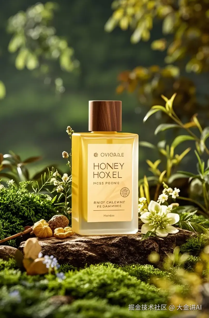 帮我生成图片:即蜂蜜精华护肤品包装设计,包装产品摄影,瓶身的设计灵感来源于香水瓶半透明磨砂玻璃,采用自然风格的构图,简约、修饰、细致的微缩模型、怀旧的自然、木材、花卉、有机和流体,产品设计,产品拍摄,电商,4K