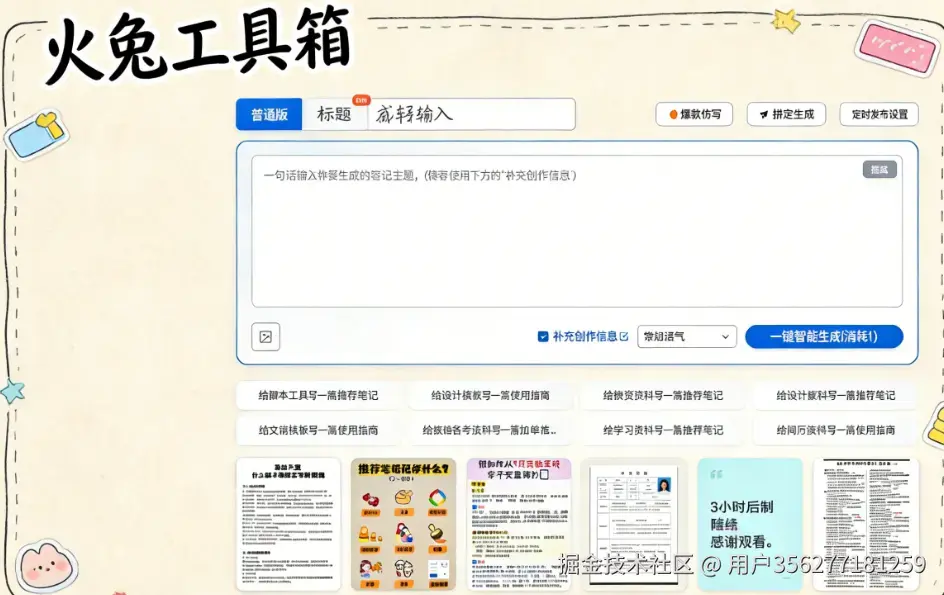 火兔工具箱的一键生成功能能完美承接这些需求,输入调教指令后,几秒就能生成符合要求的文案初稿,不用再逐字逐句打磨,效率直接提升80%。生成后还能一键同步调整,补充个人真实体验,让内容摆脱机械感。