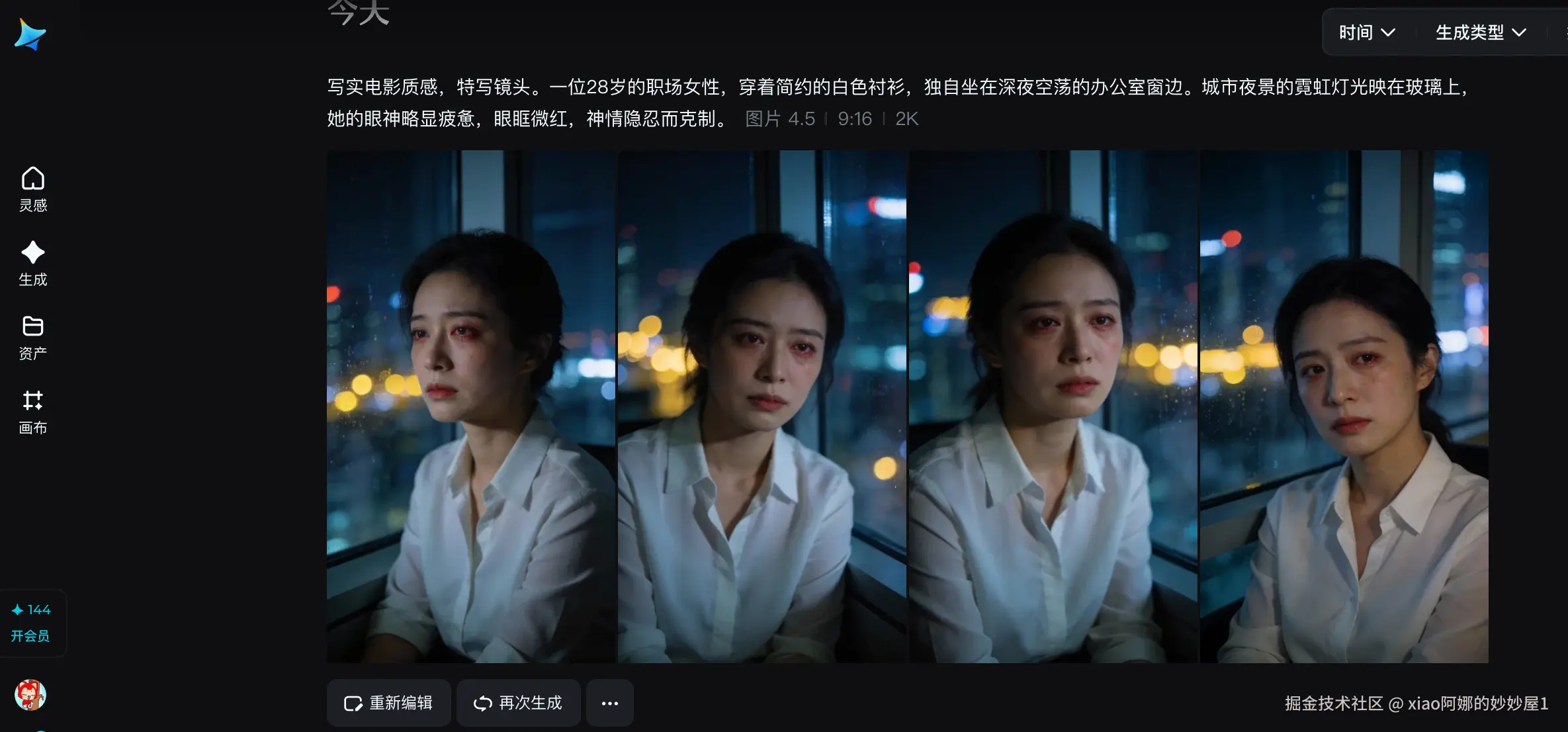 我们要先生成一张高质感、光影对味的角色图。即梦4.5的语义理解能力非常强,能精准还原我也想要的“疲惫但克制”的质感。