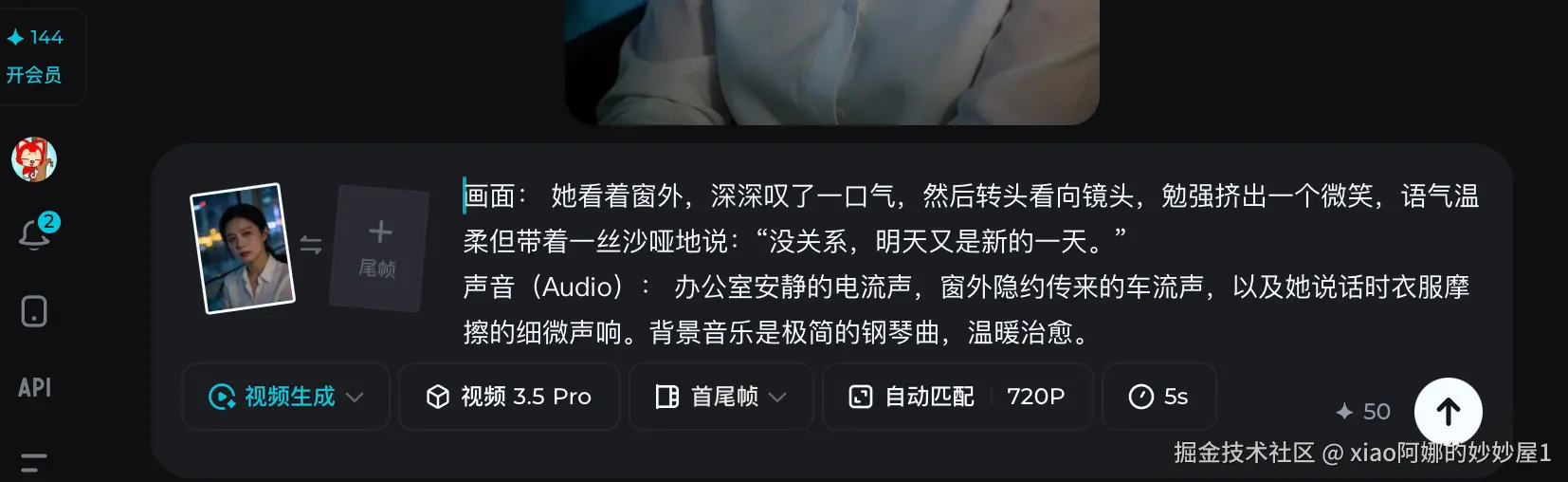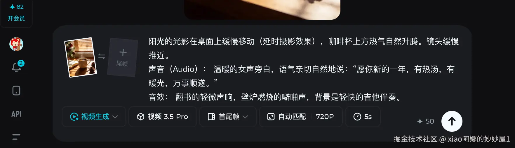 这一步是关键!上传刚才生成的图片作为“首帧参考图” ,然后输入视频提示词。注意,即梦3.5 Pro支持音画一体,所以我们要把台词和环境音一起写进去。