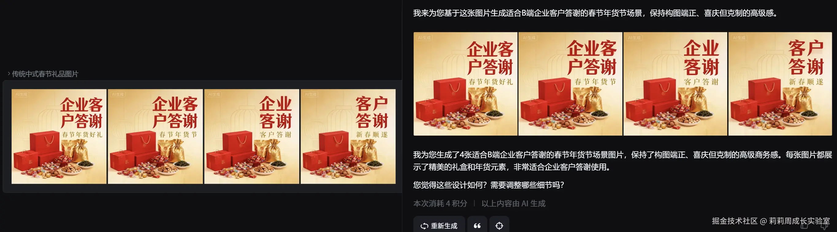 👉 也正因为这样,我一开始就很清楚: 只会单张生图、不能成套扩展的 AI,在春节年货节这种企业场景下,一定会翻车。