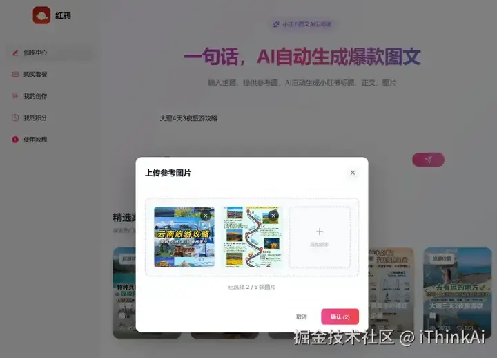 •第一步:输入主题 输入你的核心关键词,比如“大理 5 天 4 夜深度游攻略”。如果你有看中的爆款对标图,直接上传参考。