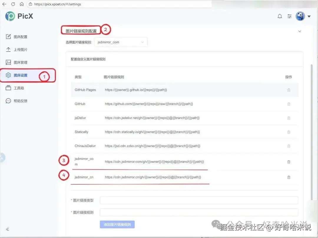 在【图床设置】中设置图片链接规则指定到 jsdmirror, 如下图设置。