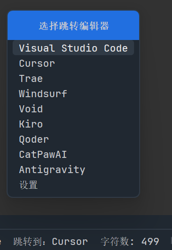 - 功能:打通 JetBrains 全家桶与新兴 AI 编辑器(Cursor/Trae/Windsurf)之间的壁垒。一键跳转,支持打开同一个目录与文件,