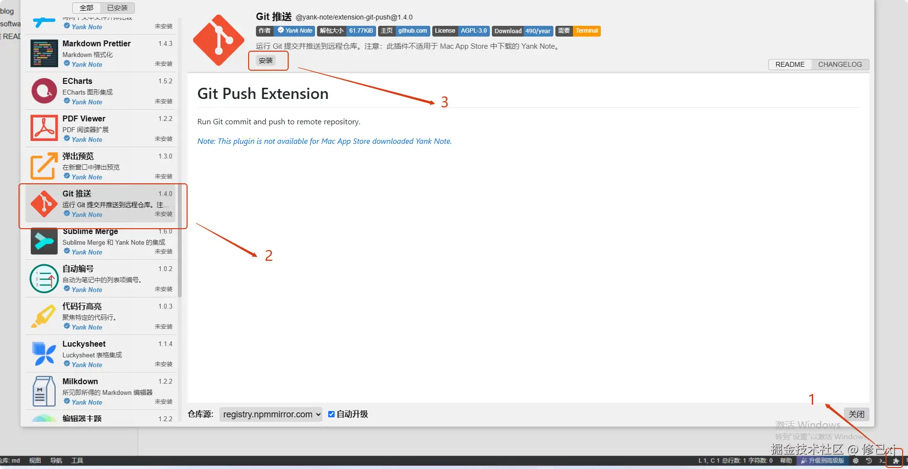 | Git 推送 | Yank Note | 运行 Git 提交并推送到远程仓库。注意:此插件不适用于 Mac App Store 中下载的 Yank Note。 | |