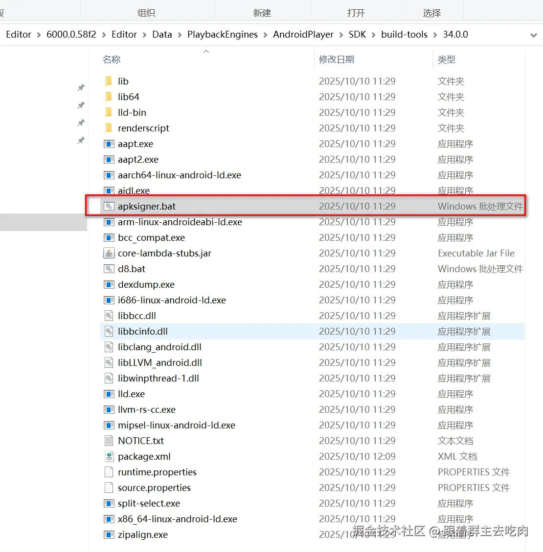 这个步骤相对复杂一点。首先我们要从oppo平台或运营处拿到这个空包,这个空包的作用是oppo平台用来验证我们游戏包的,空包如: OppoSignVerify.apk,然后我们要对空包用我们游戏包的keystore签名。我们找到apksigner工具所在的目录,它一般会在android sdk 的build-tool目录底下,如图: