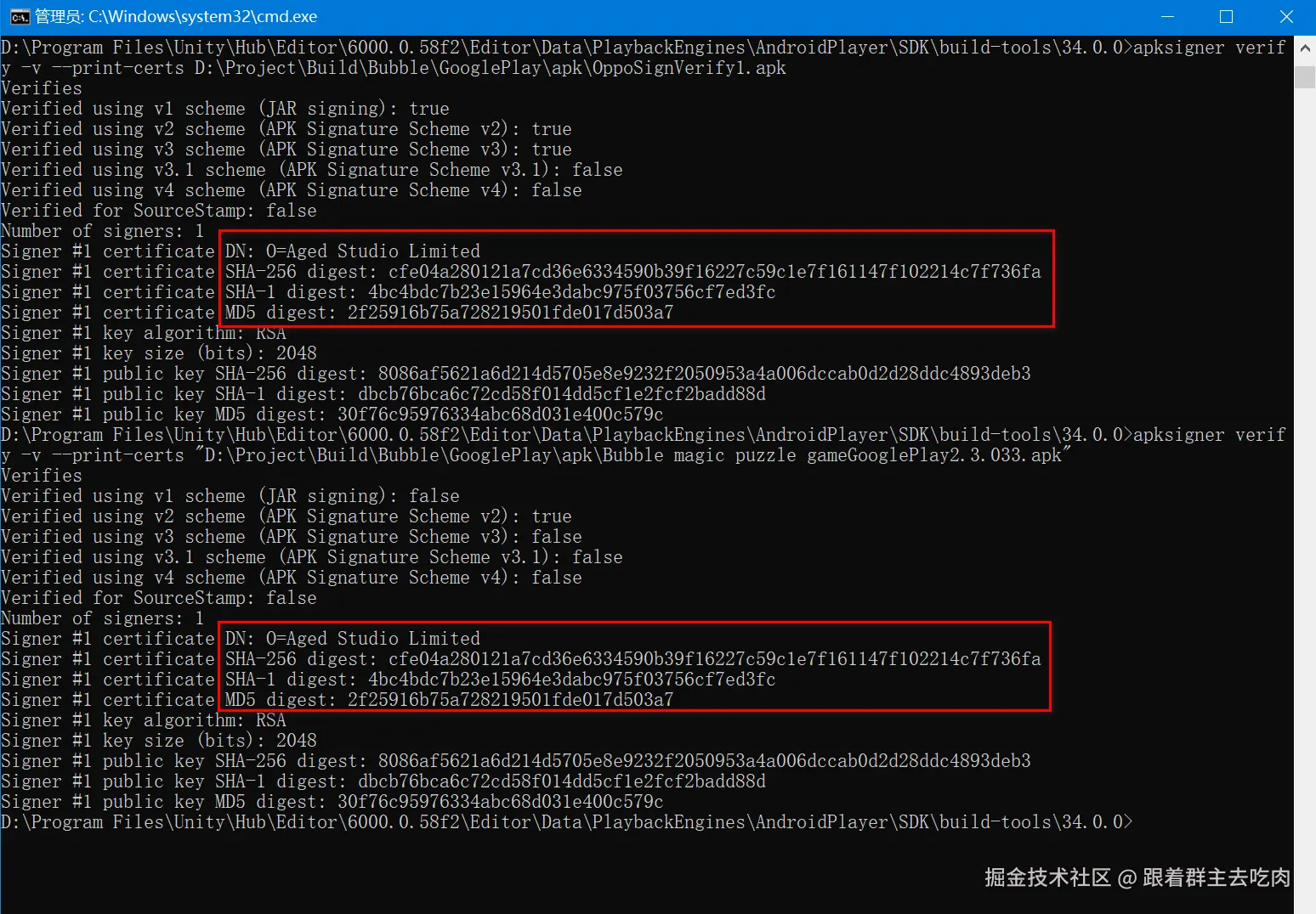 我们制作了游戏包与验证包之后,需要验证一下两者的签名是否一致。如果是一致的话,证明两者是可以通过Oppo平台审核的。我们还是打开CMD窗口,通过输入以下命令查看对比两者的签名,命令如下: