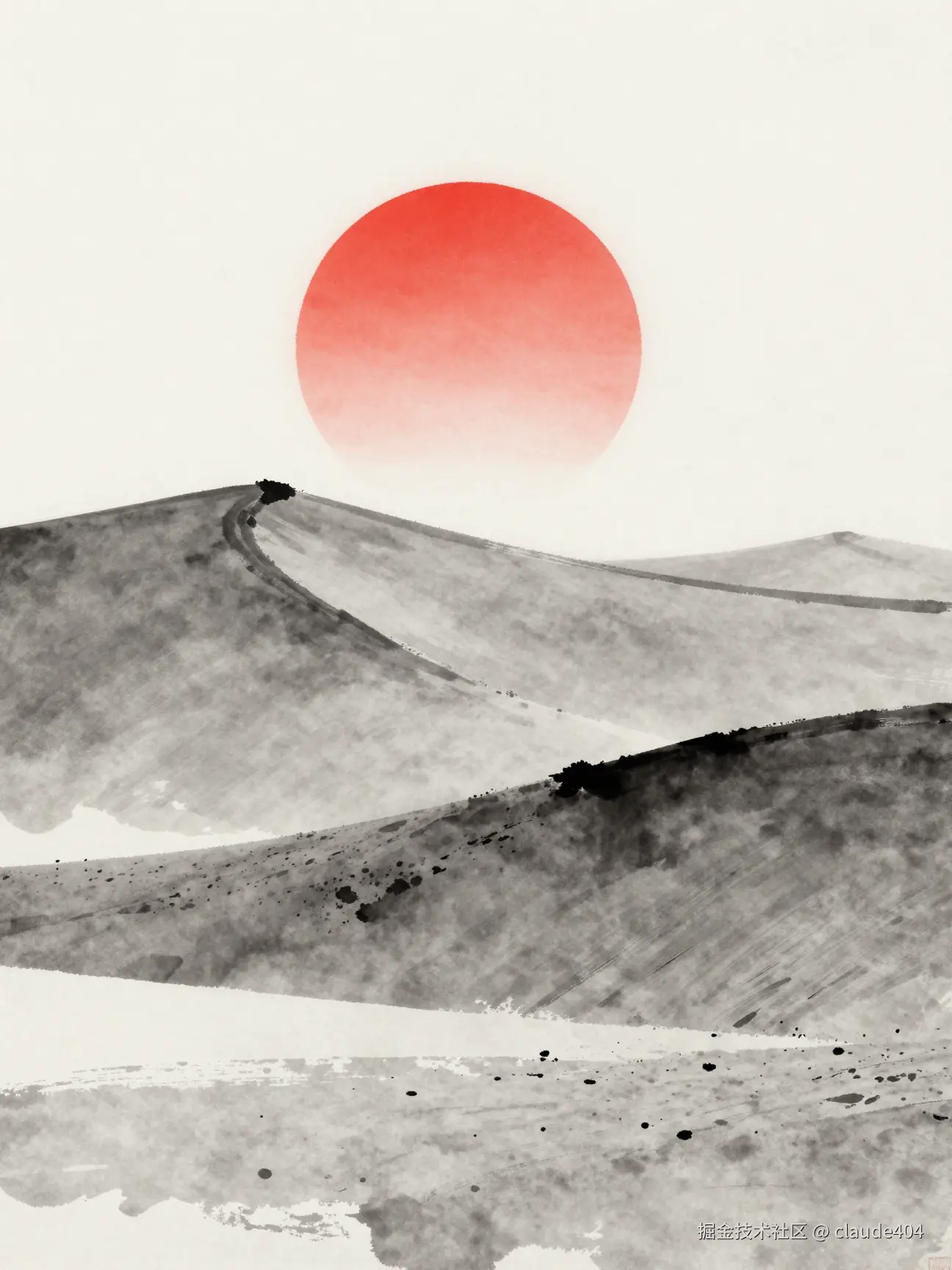 我们使用提示词:“大漠孤烟直,长河落日圆,水墨画风格,极简主义”。