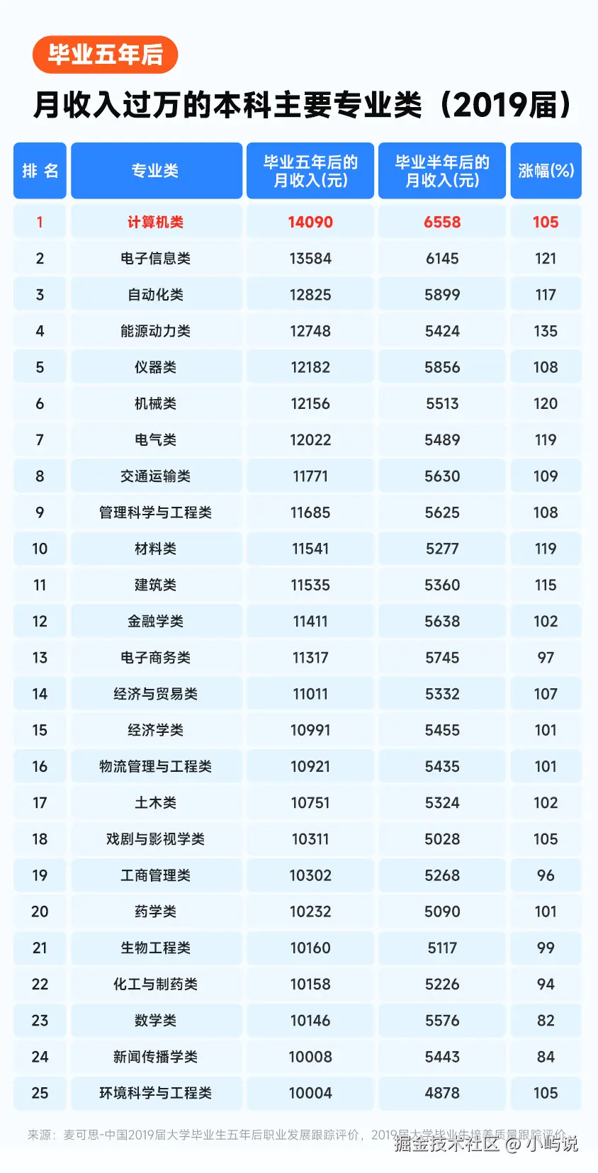 该榜单追踪了毕业生五年后的收入状况。在列出的众多专业中,有一个类别格外突出——它以毕业五年后平均月收入14090元的成绩稳居第一,领先优势明显。