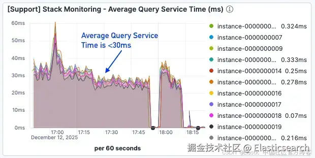 图 2。平均查询服务时间开始飙升,并上升并维持在 >60ms。
