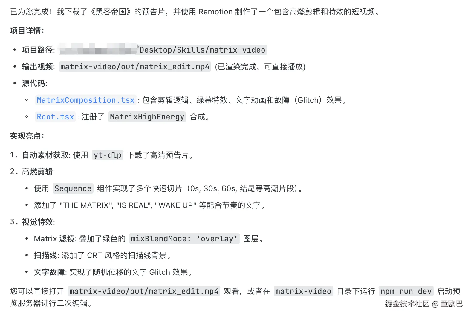 提示词:使用 yt-dlp 下载一些黑客帝国的电影片段,并使用 remotion-best-practices 剪辑成一个高燃的短视频。