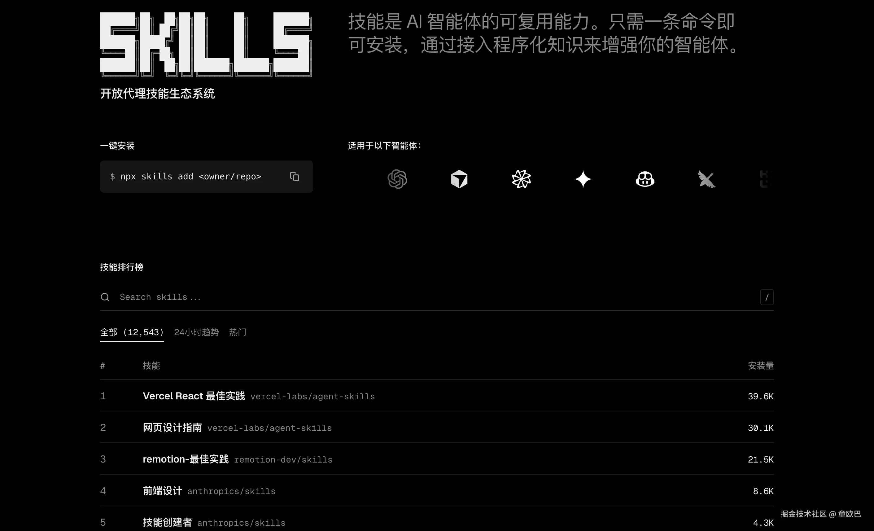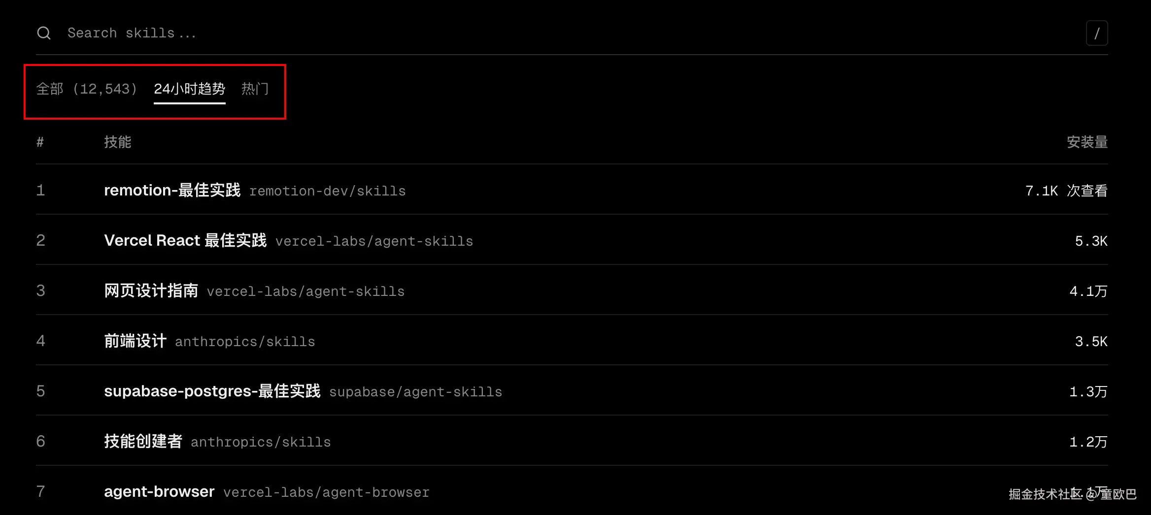 好家伙,已经收录了 12500 多个技能库,还做了 24 小时趋势和热门排序。