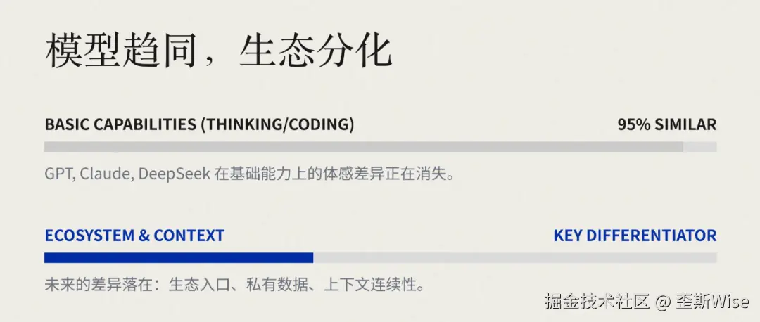 我说的趋同主要是基础能力与主流体验层,差异更可能落在生态、数据、上下文和分发上。