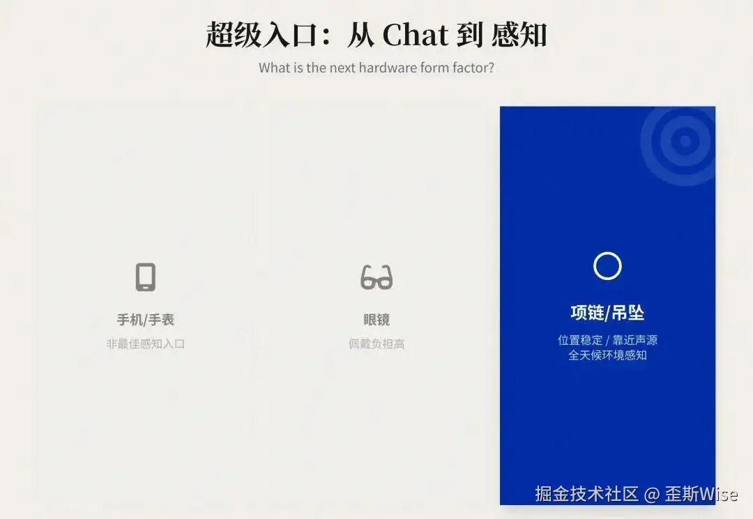我觉得很多人不戴眼镜,也没有人愿意24小时戴耳机,手表和手机不是一个特别好的感知入口。