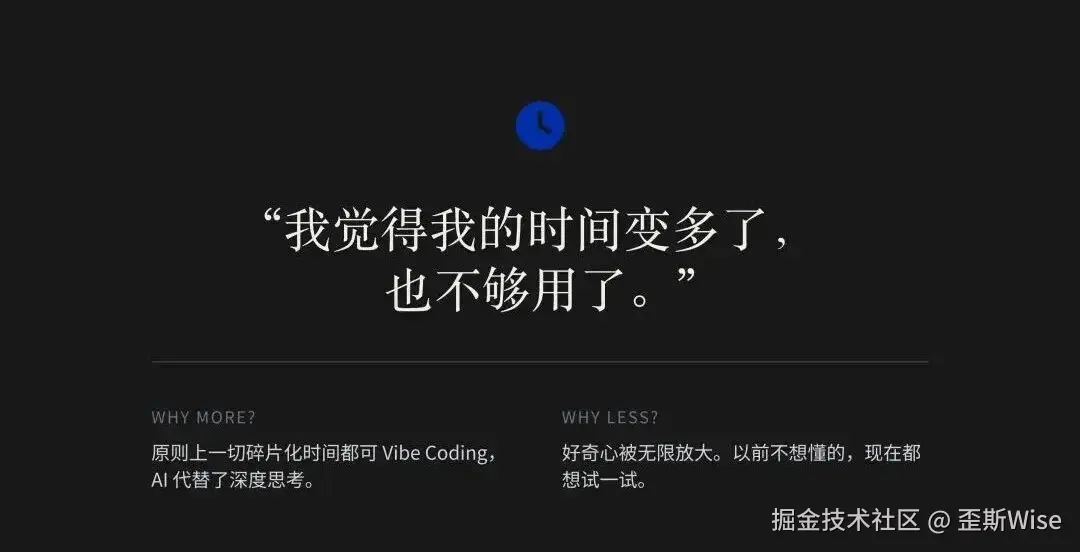 我觉得我的时间变多了也不够用了。变多了是原则上类似会议或者一切碎片化时间我都可以vibe coding,因为在我忙碌的时候,它能代替我思考和干活。