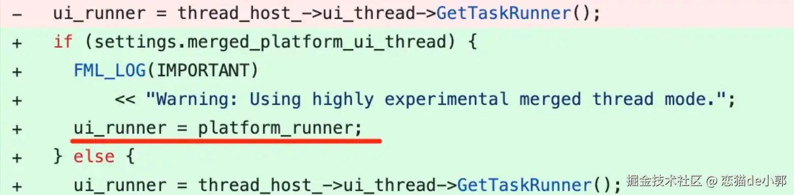 而在 3.29 里,作为改进移动平台上 Native 和 Dart 互操作系列调整中的一部分,两个线程被合并了,说人话就是: UI Runner = Platform Runner :