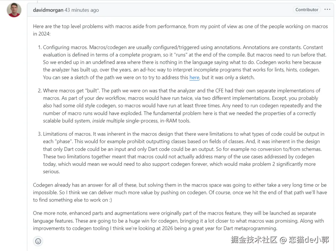 Flutter 在 2025 年 1 月的时候,开年就送上了大礼,官方决定 Dart 宏功能推进暂停,后续专注定制数据处理支持,宏功能是在 2024 年初开始决定推进的,而 2025 年开年,官方得到了一个结论: