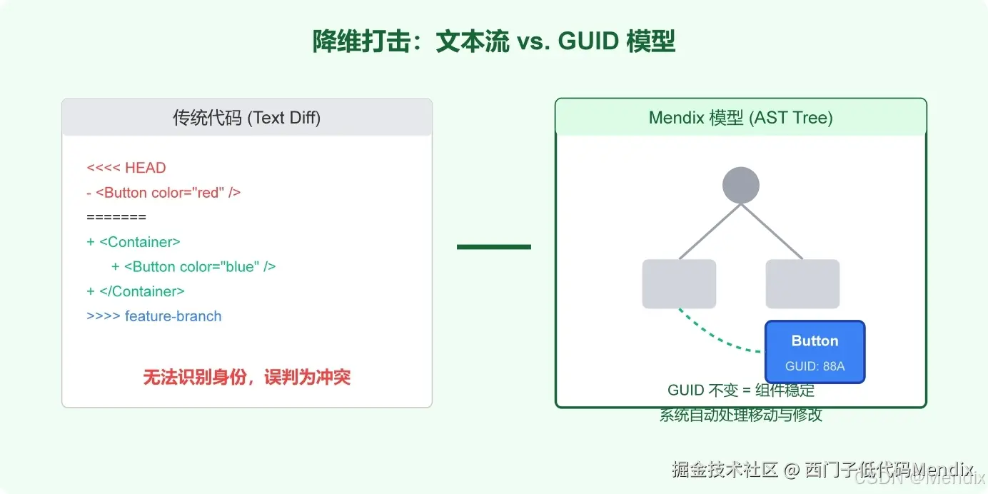 Git 的原生逻辑是“行级对比”——它只识字符,不识逻辑。 而 Mendix 的底层引擎(Model Server)建立在 AST(抽象语法树) 与 GUID(全局唯一标识符) 的“对象级对比”之上。