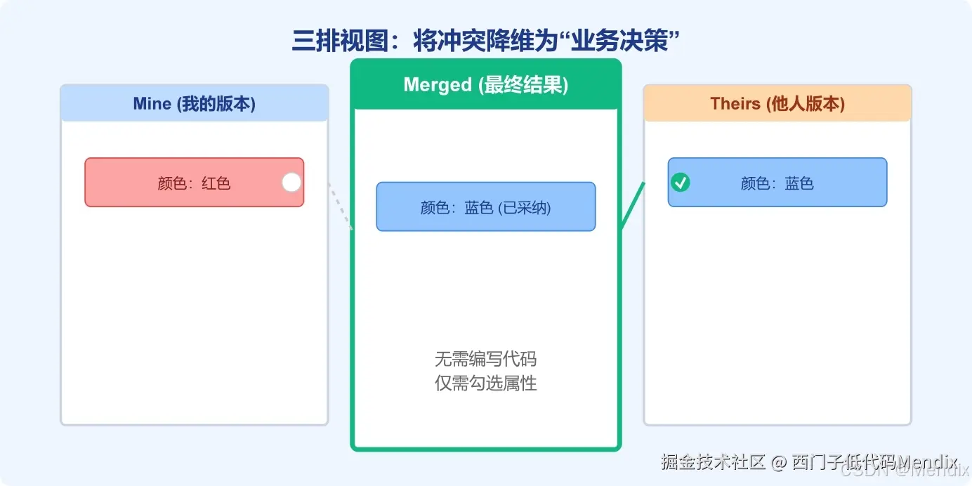 当确需人工介入时,Mendix 并未抛出枯燥的代码对比框,而是提供了所见即所得的“三排合并视图”。这是将 Git 流程“平民化”的关键设计。