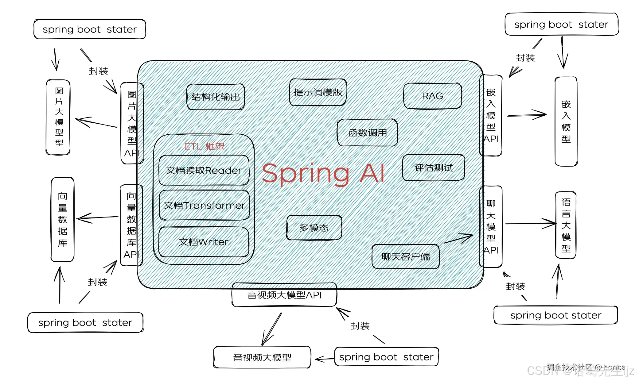 Spring AI:作为大模型应用开发的核心框架,提供了统一的大模型调用接口、对话模板、上下文管理抽象,可快速集成不同厂商的大模型,降低开发成本。其强大的依赖注入、AOP 特性也便于对接企业现有 Spring 生态系统。 官网地址www.spring-doc.cn/projects/sp… "docs.springframework.org.cn/spring-ai/r…<> "点击并拖拽以移动")编辑