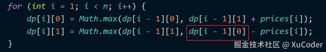 dp[i][1] = Math.max(dp[i - 1][1], dp[i - 1][0] - prices[i]);