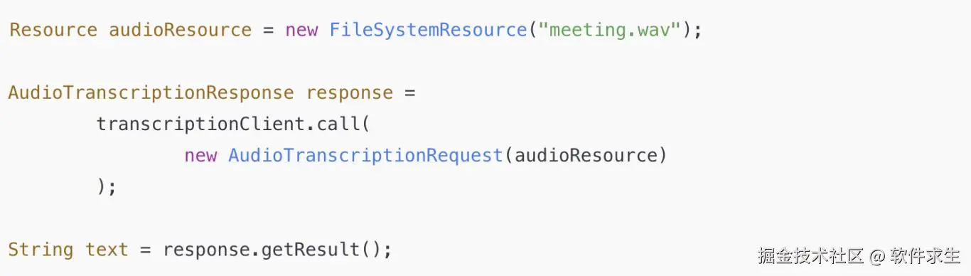 先说结论,再讲细节。在 Spring AI 里,用 OpenAI 的 Whisper 模型做转录,本质就是一句话: