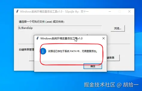 2、工具会自动检测该路径是否已存在于系统环境变量中,如果存在会弹出避免添加重复的提示。
