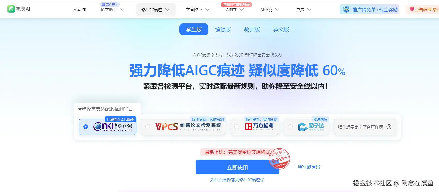 功能简介:主打一站式服务,查完重直接点智能降ai,体验很丝滑。它的改写策略偏保守,不会出现太离谱的逻辑错误,适合AI率超标不是特别严重的论文。