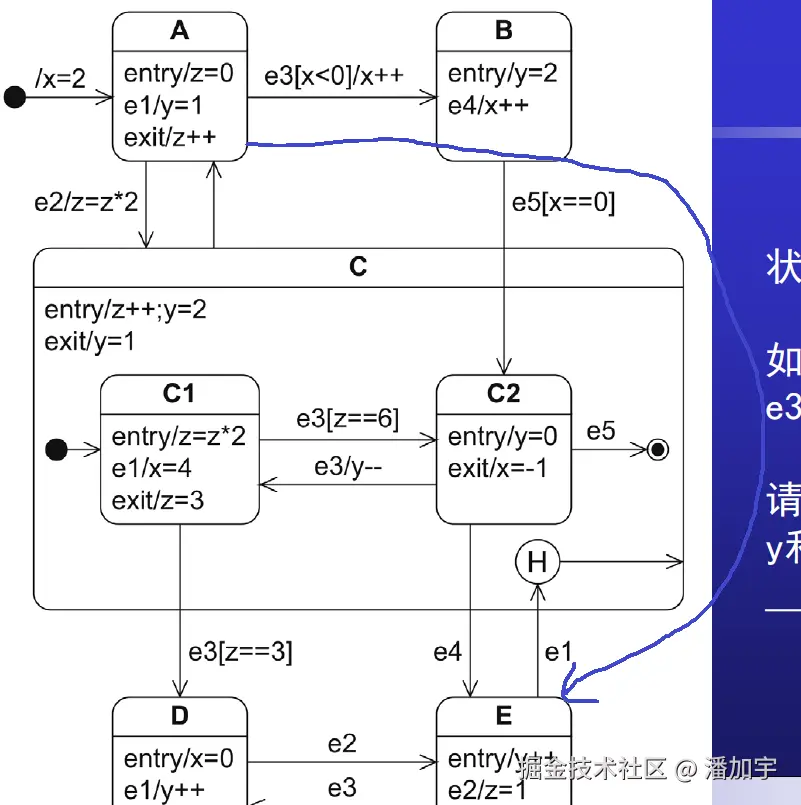 另外,历史是C的历史,C进入终态,C的历史应该被清除。按照你说的另一条路的场景,在E发生e1时,C应该没有历史,因此迁移到历史状态指向的C,C的缺省状态是C1。