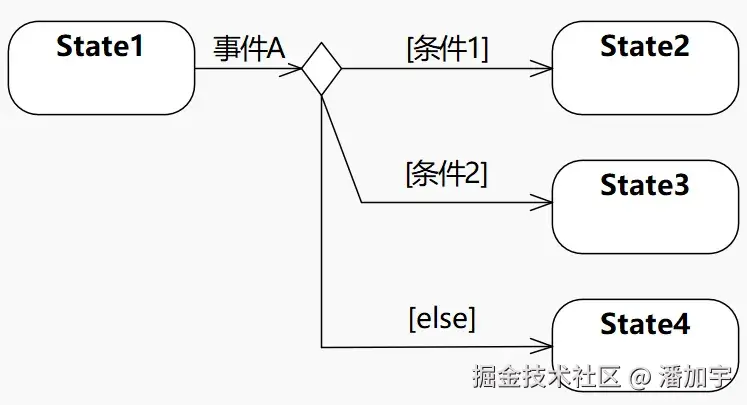[答疑]迁移的警戒条件一定要完备不重叠吗 潘加宇 2026-01-26 18 阅读1分钟 StevenZ 2022-4-12 20:01 老师,这里说离开转换的条件要完备不重叠,那如果位置不在充电站就不做任何事,是不是就不用画两个条件了 UMLChina潘加宇 这个是我至少15年前的幻灯片了,上面的内容说得确实不严谨。 下面这两种都是可以的,即使条件1和条件2合起来不完备: 只要使用了选择(choice)结点时,条件才需要“有且只有一个为真”,如果条件1、2不完备,需要加一个else。