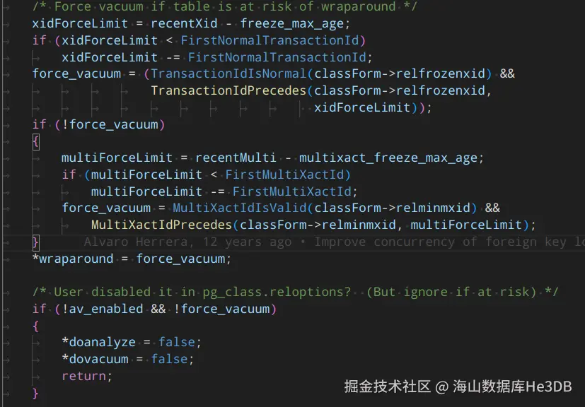 (2)判断 XID 回卷风险:同时满足表的relfrozenxid是正常事务 ID和relfrozenxid 早于 xidForceLimit,则标记force_vacuum = true(存在XID回卷风险);
