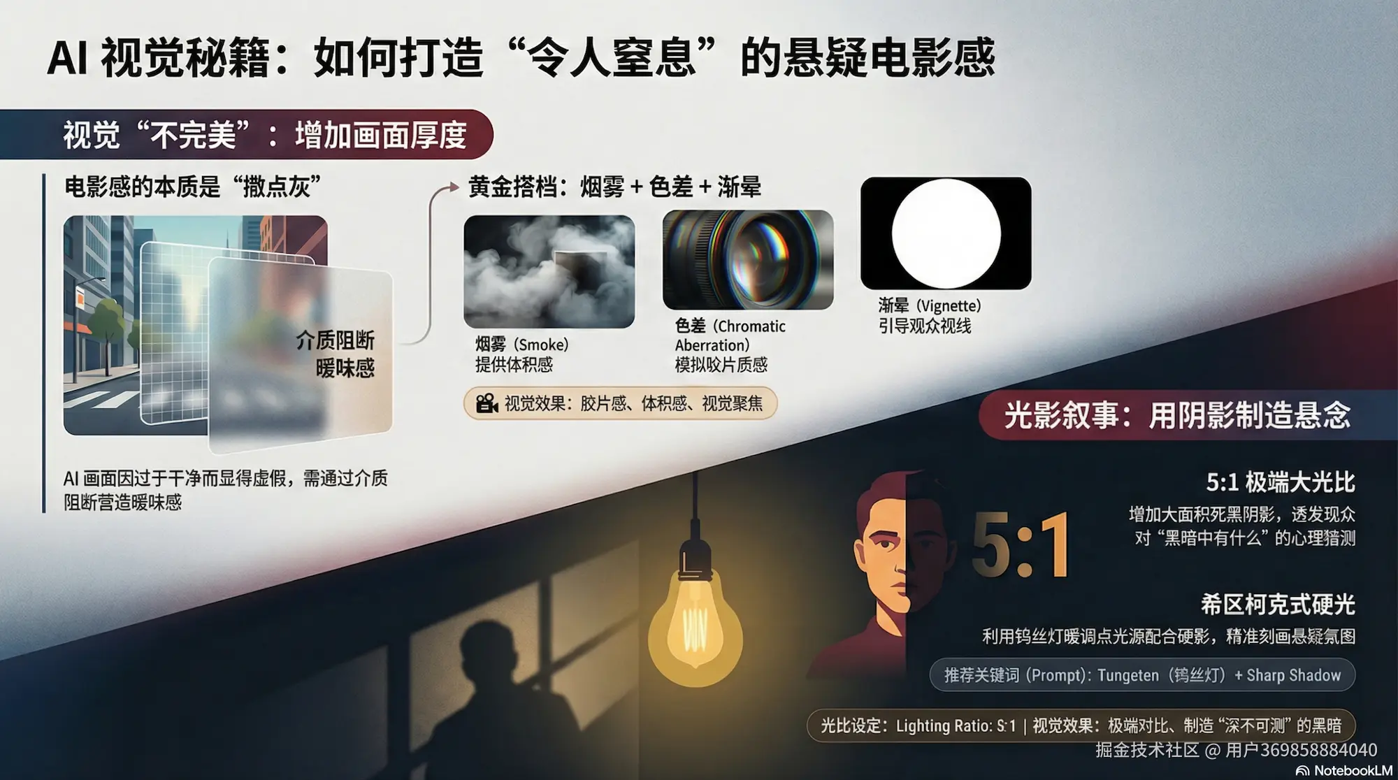 • 原理: 想拍出希区柯克式的悬疑感?使用 钨丝灯 这种暖调点光源,配合 5:1 的大光比。大面积的死黑阴影会让观众不由自主地去猜测“黑暗里有什么”,这就是高级的视觉引导。
