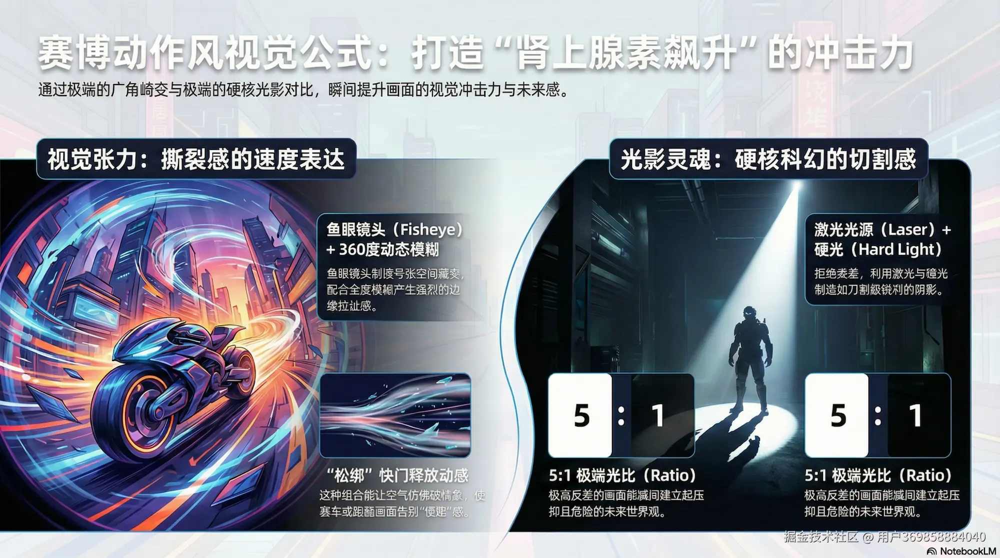 • Prompt: Light Source: Laser (激光) + Quality: Hard Light (硬光) + Ratio: 5:1 (极端对比)