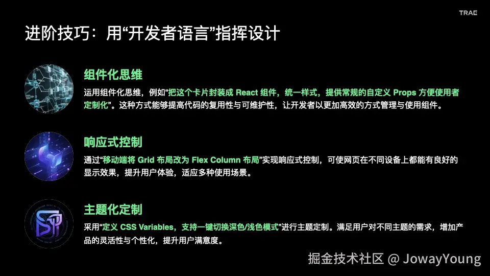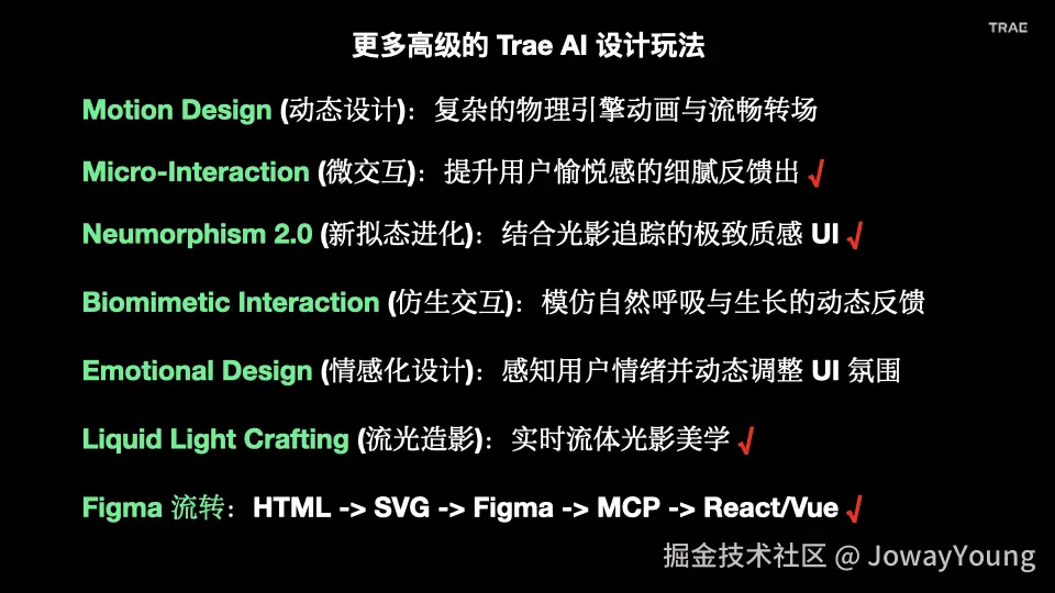 - 利用 Trae 将你认可的设计风格、交互模式固化为结构化的 Prompt