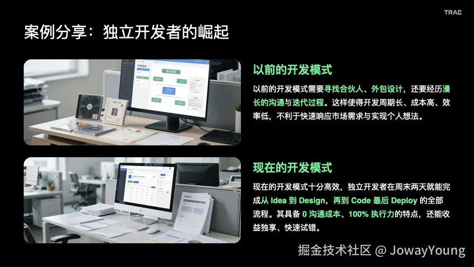 - 现在:每周利用周末两天,从 Idea 到 Deploy,0 沟通成本,100% 执行力