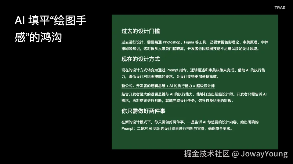 - 现在的设计方式:通过 Prompt 指令、逻辑描述和审美决策来完成