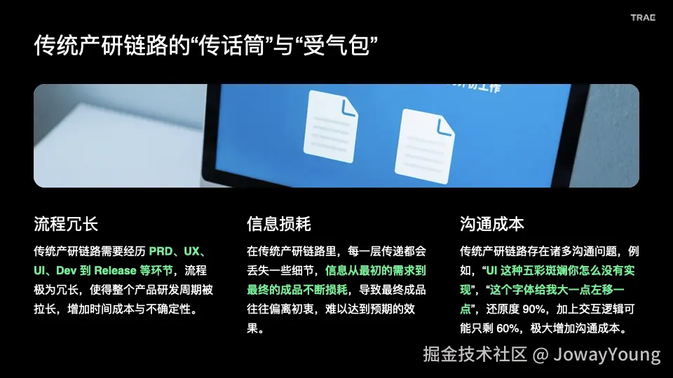 - 流程冗长:从 PRD、UX、UI、Dev 到 Release,漫长的环节拉长了研发周期,增加了时间成本与不确定性