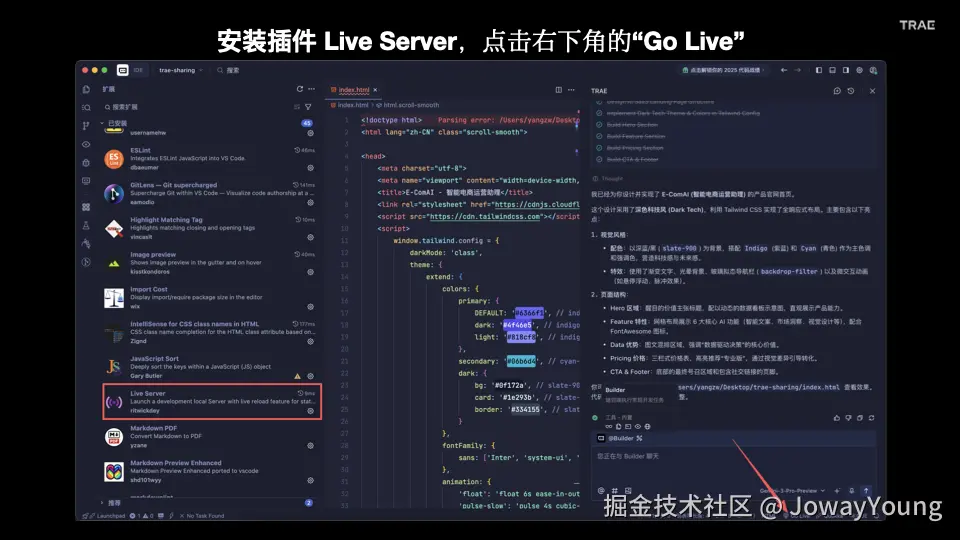 安装插件 Live Server,点击右下角的“Go Live”进行实时预览。