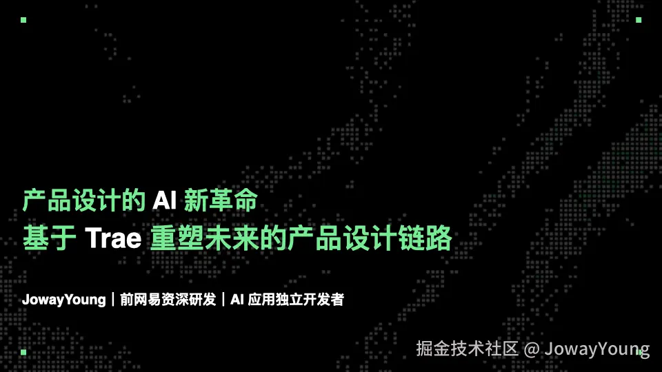 大家好,我是 Joway Young。今天想和大家分享的主题是《产品设计的 AI 新革命:基于 Trae 重塑未来的产品设计链路》。