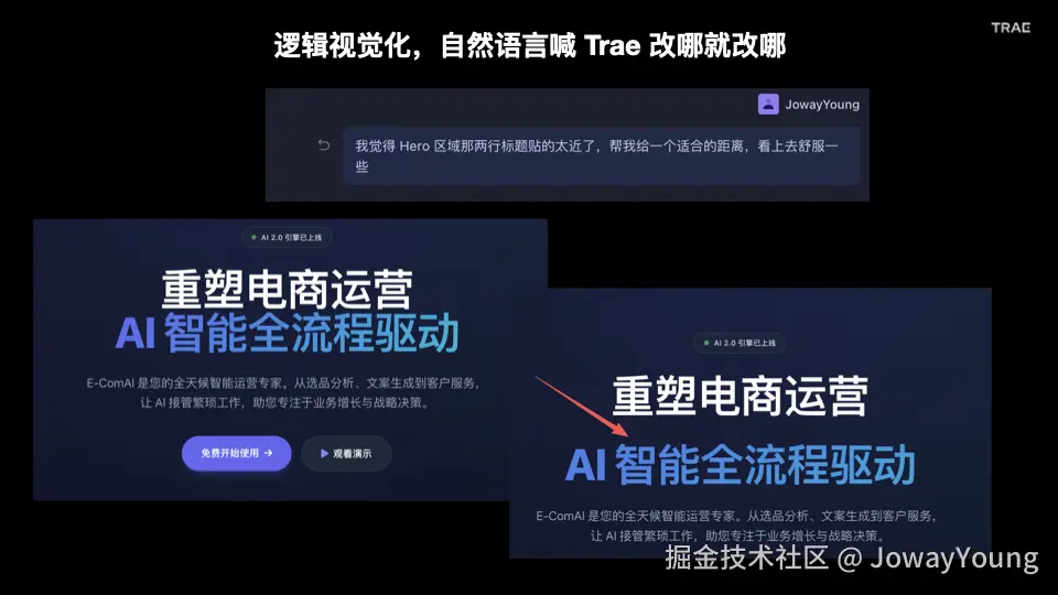 利用自然语言,指挥 Trae “指哪改哪”,将逻辑转化为视觉元素。